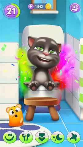 3. 买好后,药水会出现在食物盘里。点击药水喂给汤姆猫,一阵炫酷的变身特效过后,它就瞬间缩小成可爱的小宝宝了!